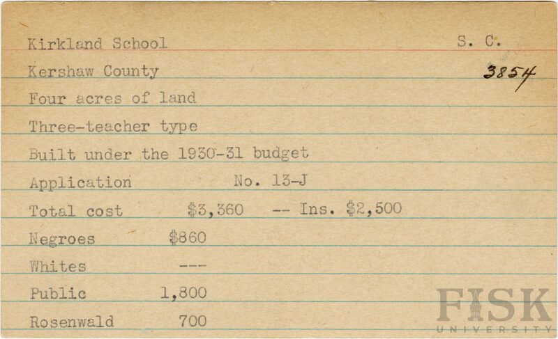 - School card from Rosenwald Fund for Kirkland School in Kershaw County, South Carolina with a section added to the budget contributions that says, "Ins. $2,500"