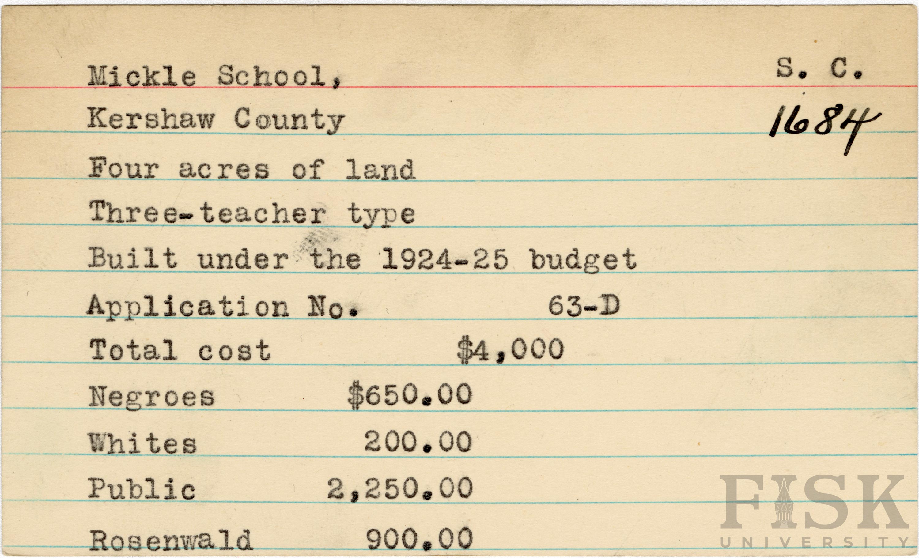 - School card from Rosenwad Fund for Mickle School in Kershaw County, South Carolina