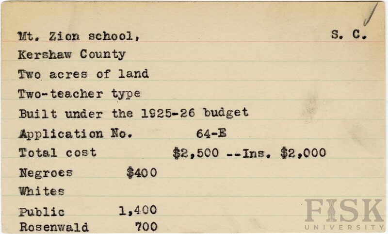 - School card from Rosenwald Fund for Mt. Zion School in Kershaw County, South Carolina with a section added to the budget contributions that says, "Ins. $2,000"
