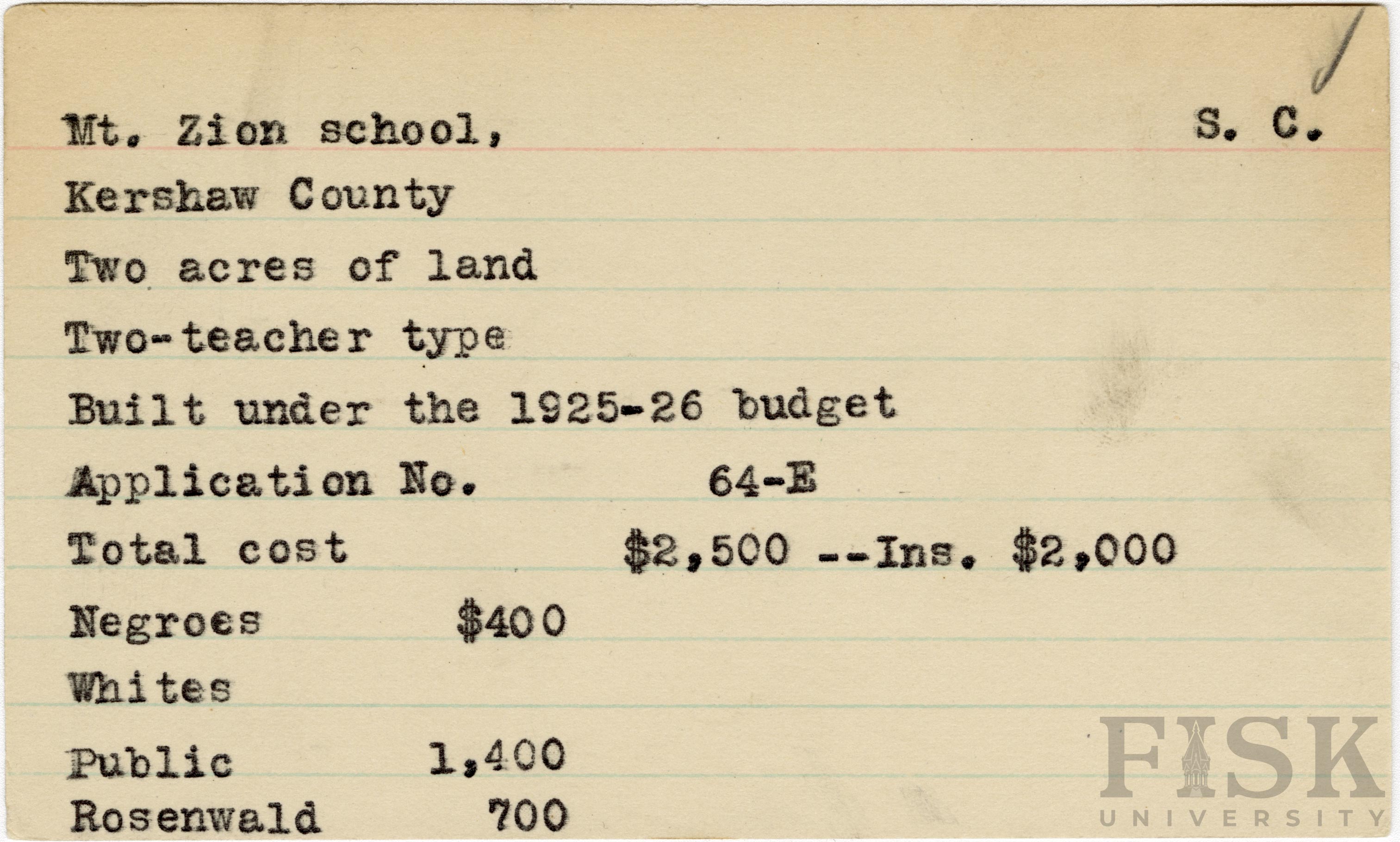 School card from Rosenwald Fund for Mt. Zion School in Kershaw County, South Carolina with a section added to the budget contributions that says, "Ins. $2,000"