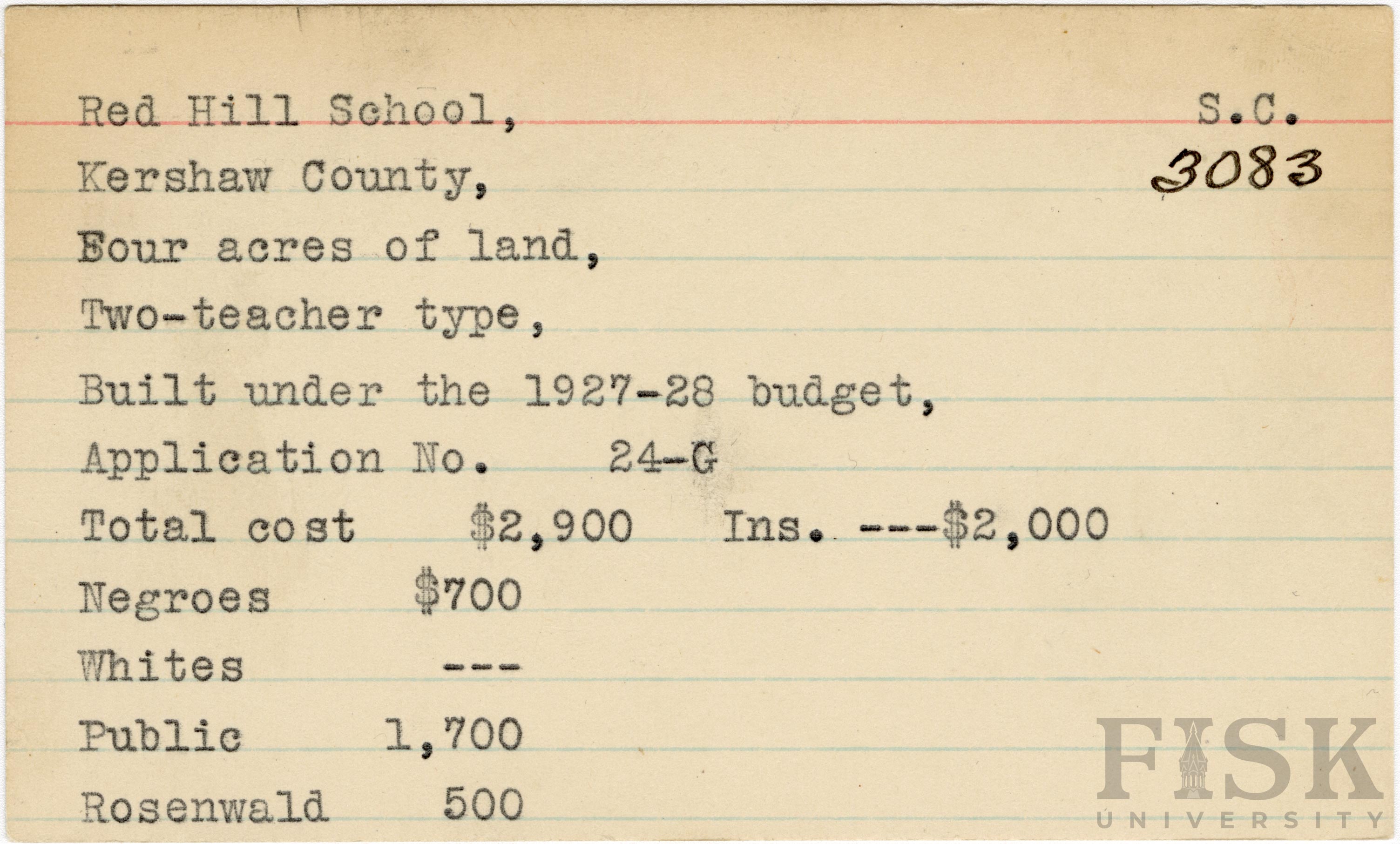 - School card from Rosenwald Fund for Red Hill School in Kershaw County, South Carolina with a section added to the budget contributions that says, "Ins. ---$2,000"