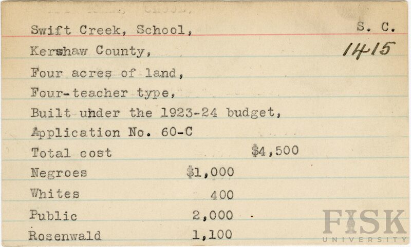 - School card from Rosenwald Fund for Swift Creek School in Kershaw County, South Carolina