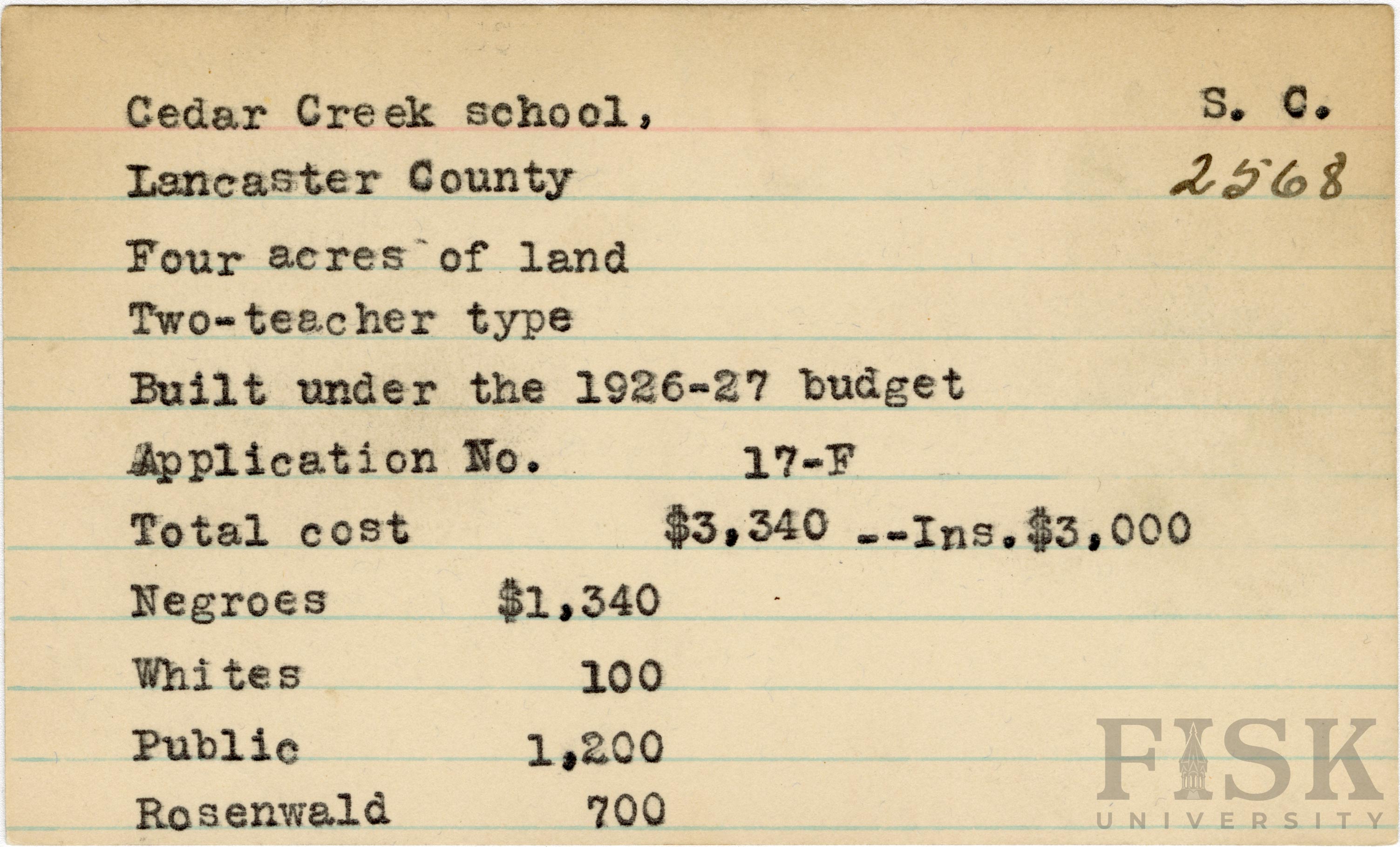 - School card from Rosenwald Fund for Cedar Creek School in Lancaster County, South Carolina with a section added to the budget contributions that says, "Ins. $3,000"