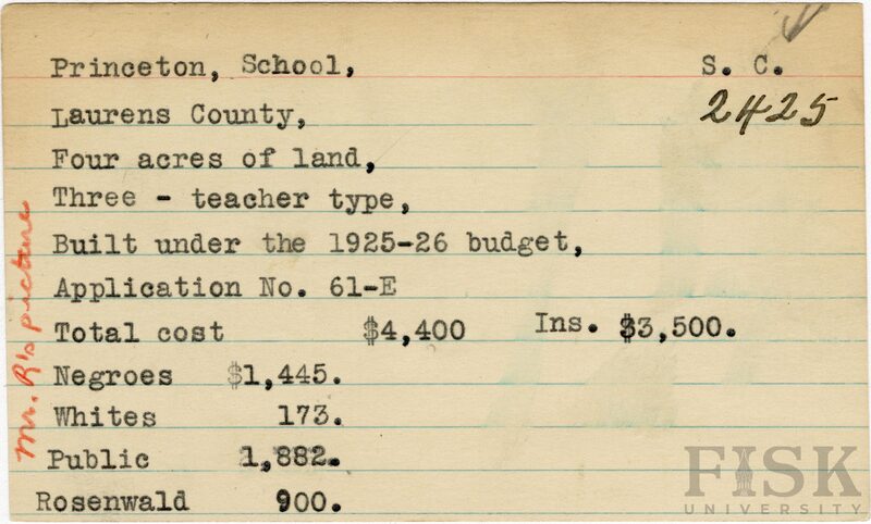- School card from Rosenwald Fund for Princeton School in Laurens County, South Carolina with a section added to the budget contributions that says, "Ins. $3,500" and a handwritten note on the far left of the card that says, "Mr. R's Picture"