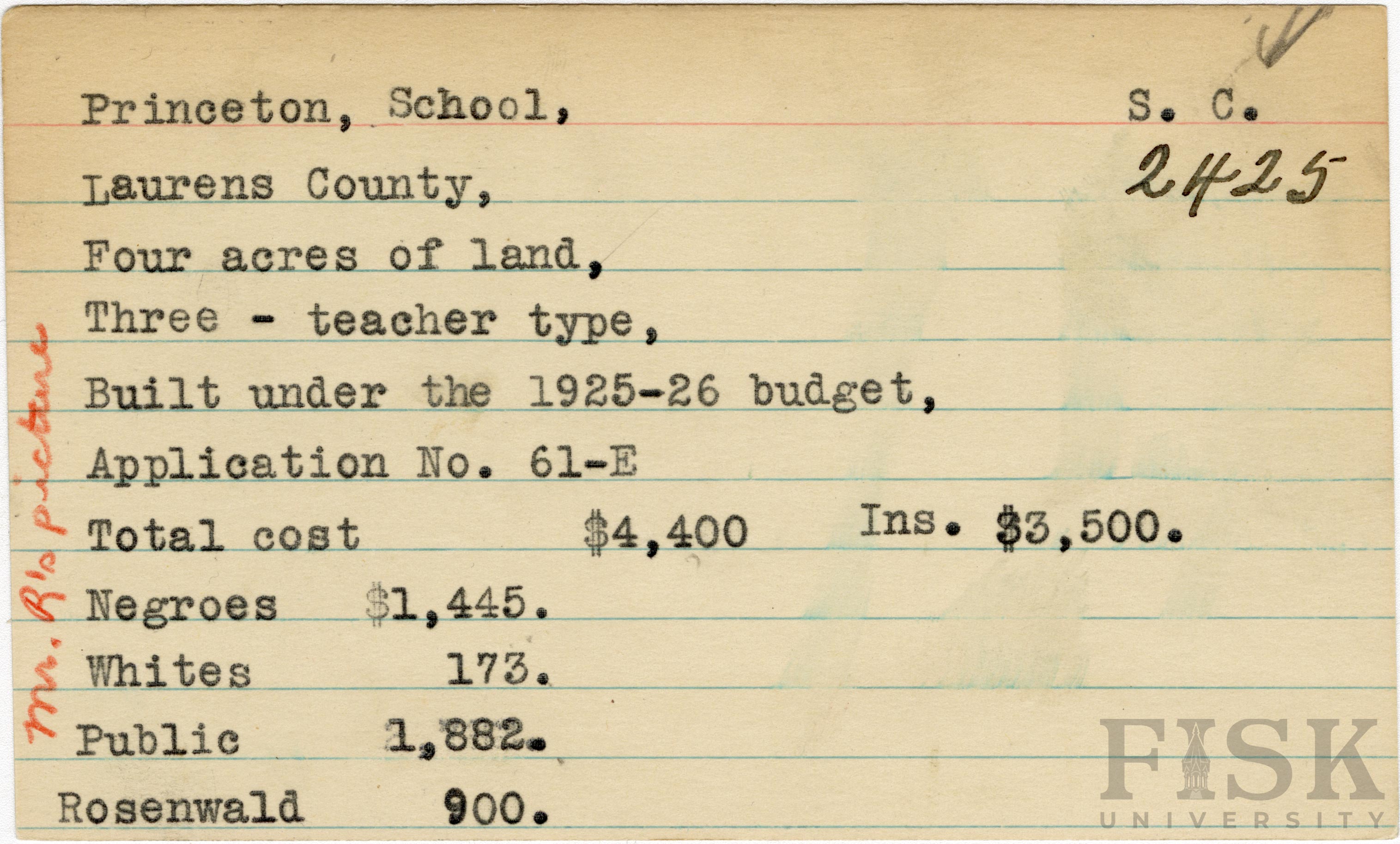 School card from Rosenwald Fund for Princeton School in Laurens County, South Carolina with a section added to the budget contributions that says, "Ins. $3,500" and a handwritten note on the far left of the card that says, "Mr. R's Picture"