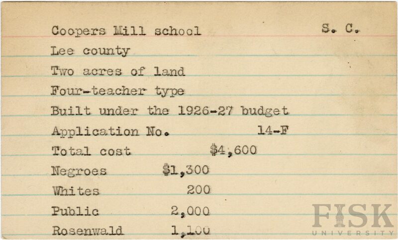 School card from Rosenwald Fund for Coopers Mill School in Lee County, South Carolina