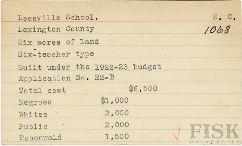 - School card from Rosenwald Fund for Leesville School in Lexington County, South Carolina