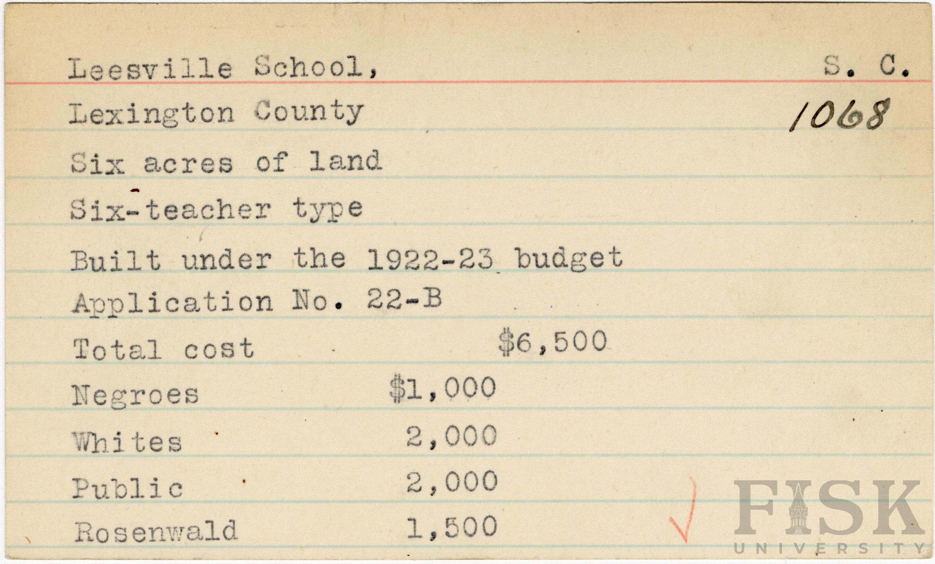 School card from Rosenwald Fund for Leesville School in Lexington County, South Carolina