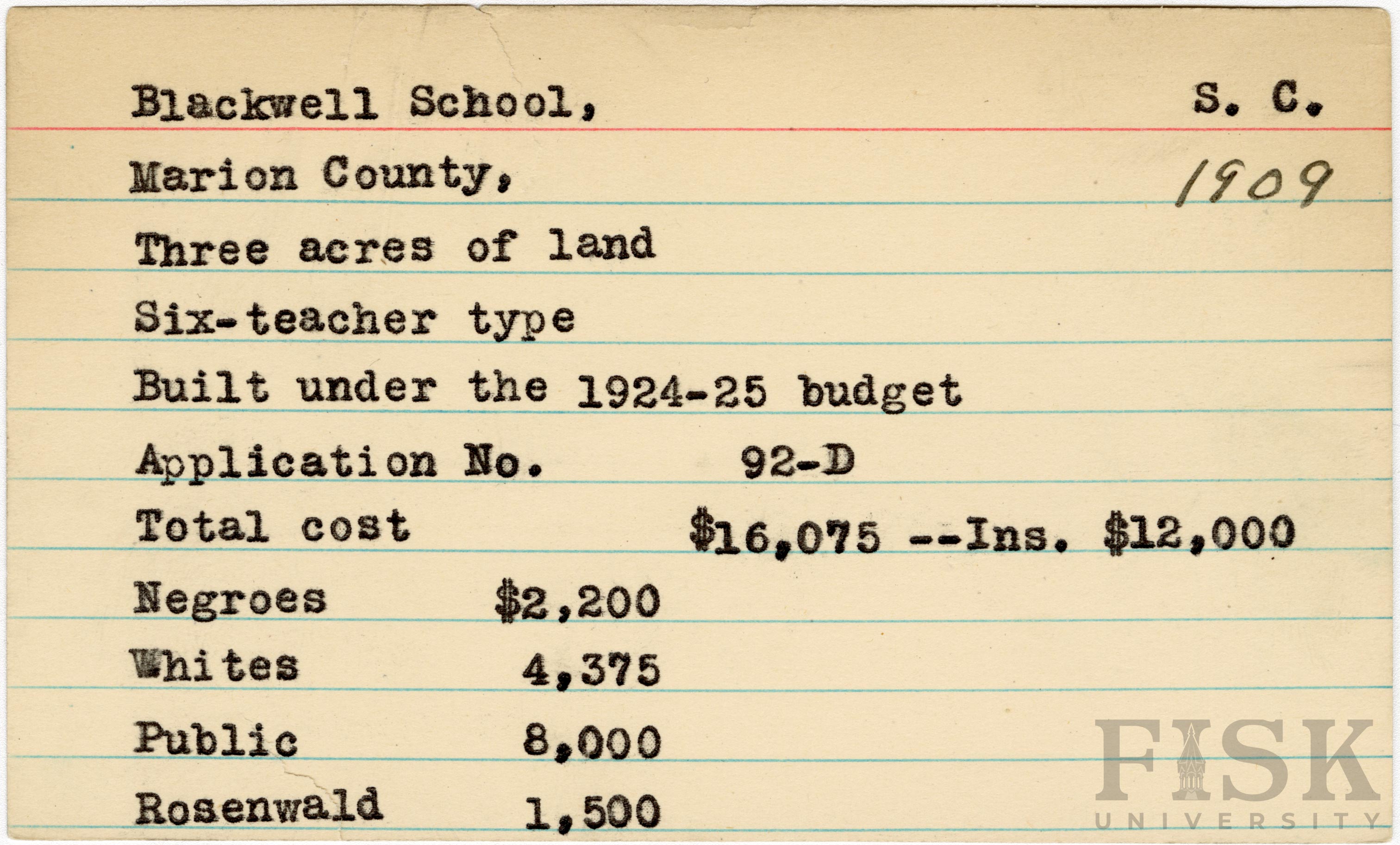 - School card from Rosenwald Fund for Blackwell School in Marion County, South Carolina with a section added to the budget contributions that says, "Ins. $12,000"