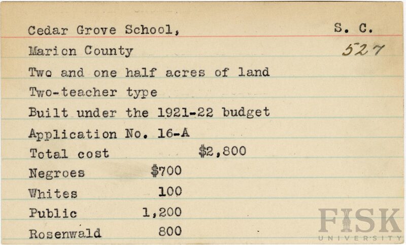 - School card from Rosenwald Fund for Cedar Grove School in Marion County, South Carolina