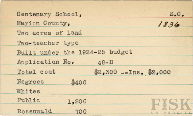 - School card from Rosenwald Fund for Centenary School in Marion County, South Carolina with a section added to the budget contributions that says, "Ins. $2,000"