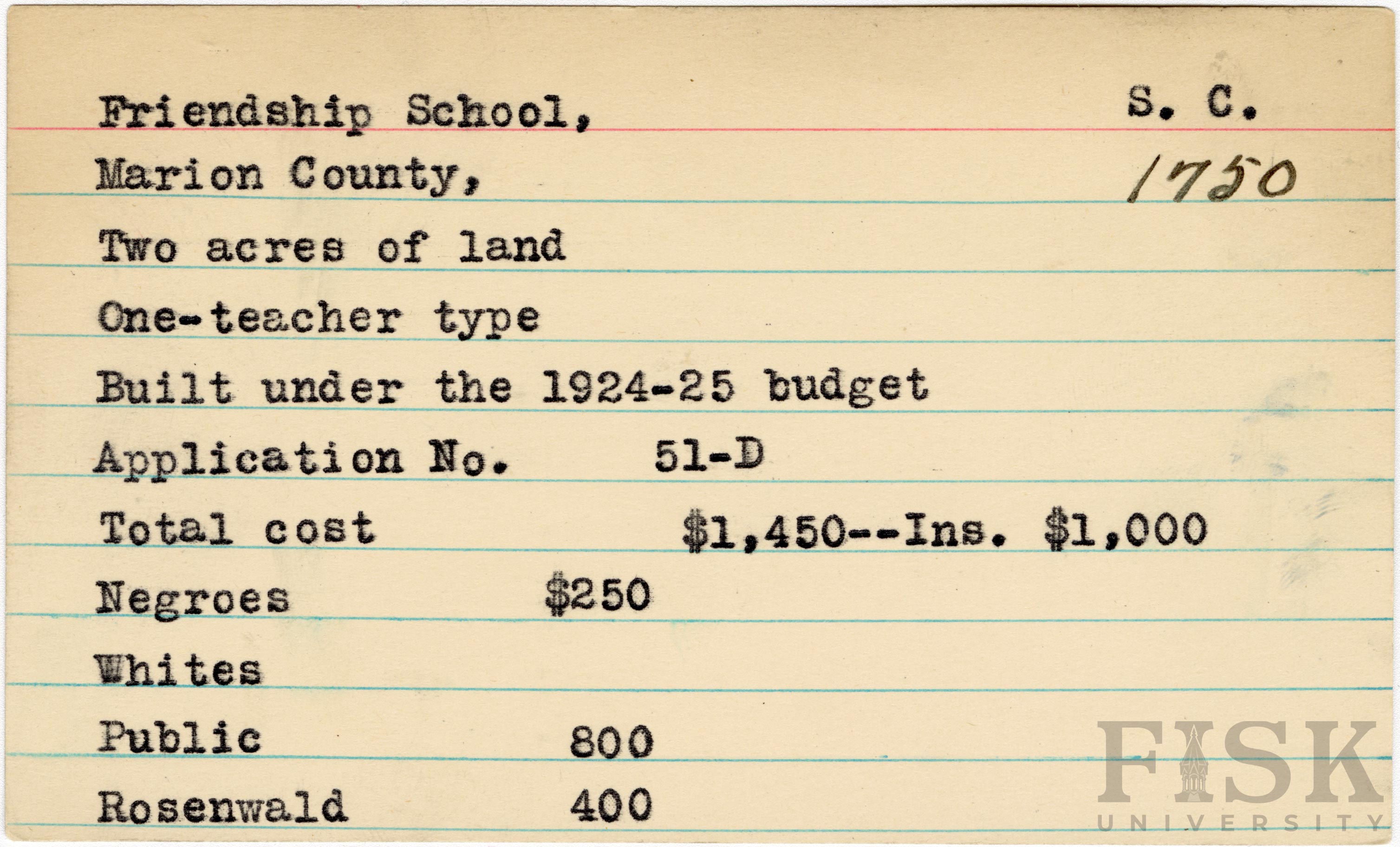 - School card from Rosenwald Fund for Friendship School in Marion County, South Carolina with a section added to the budget contributions that says, "Ins. $1,000"