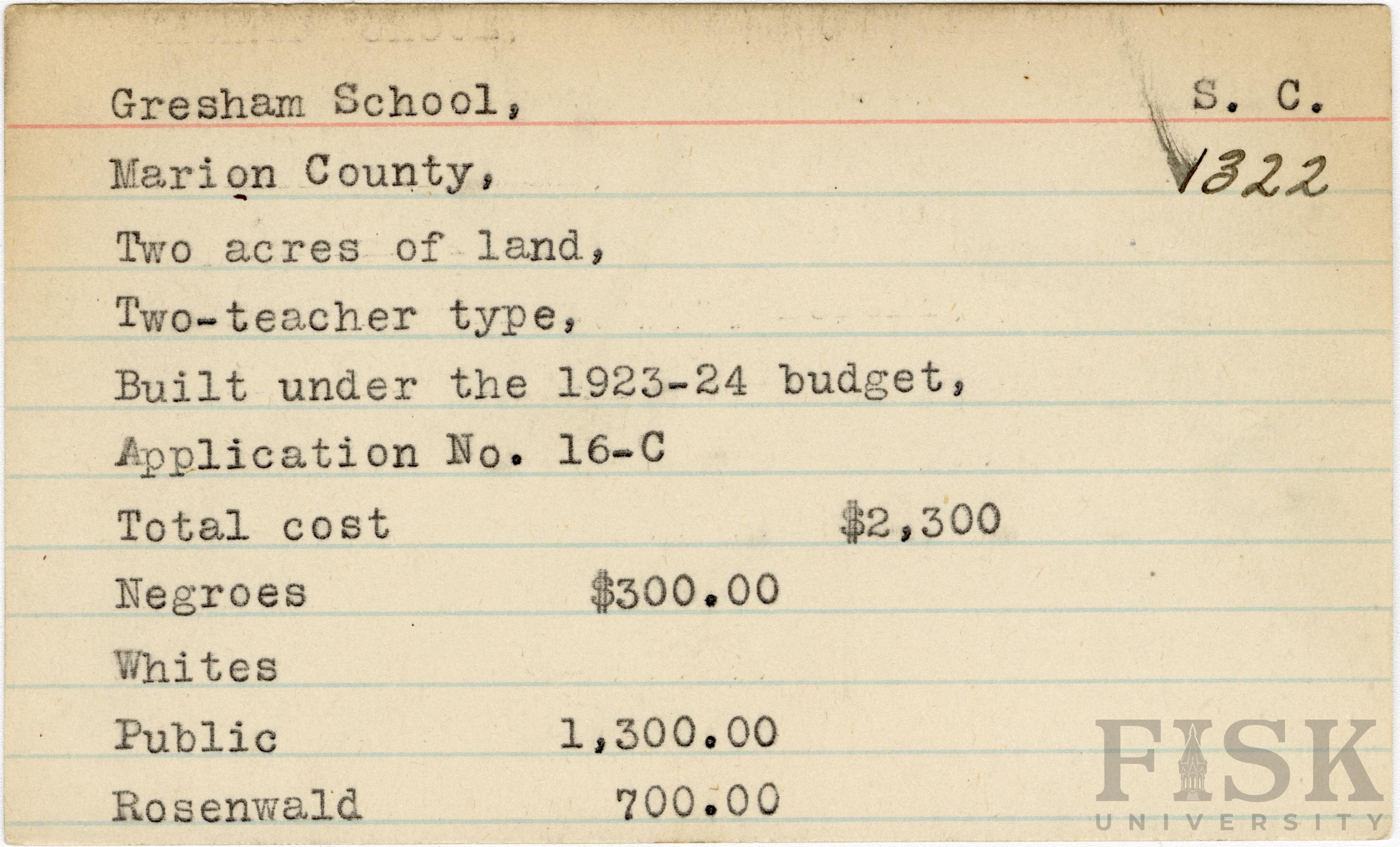 School card from Rosenwald Fund for Gresham School in Marion County, South Carolina