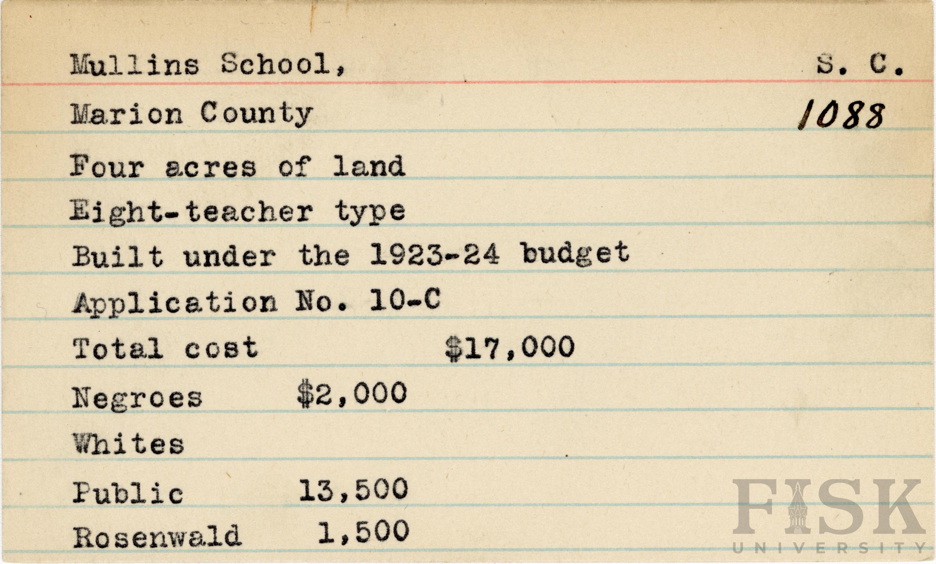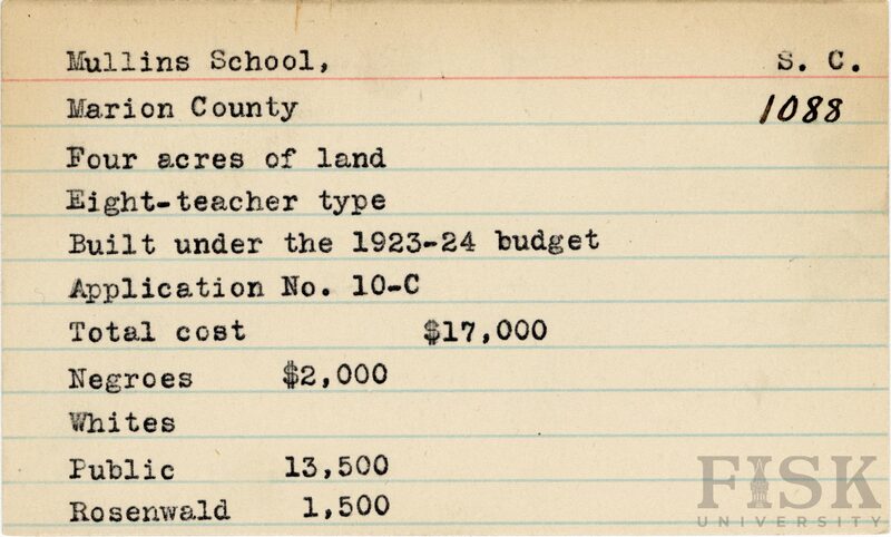 - School card from Rosenwald Fund for Mullins School in Marion County, South Carolina