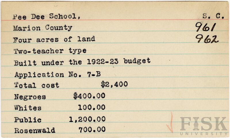 - School card from Rosenwald Fund for Pee Dee School in Marion County, South Carolina