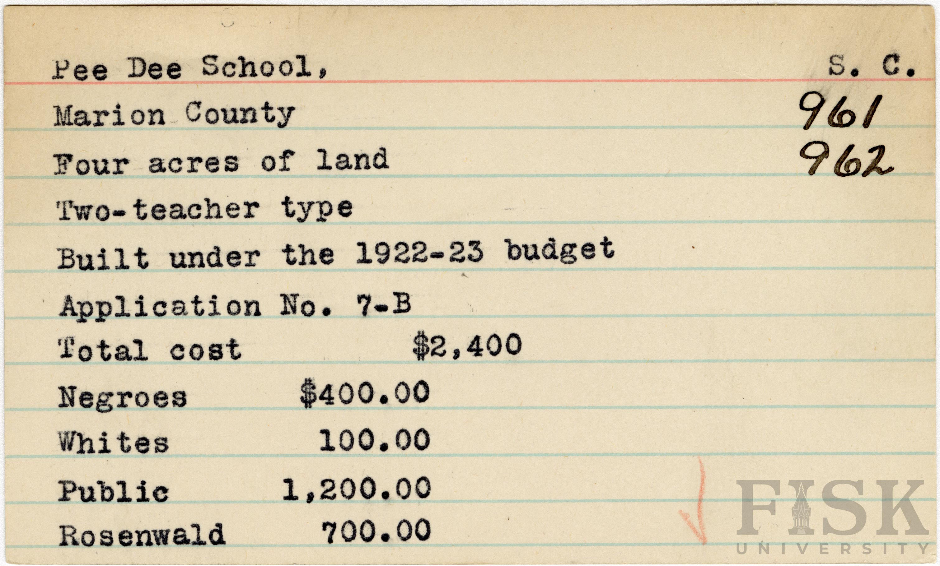 School card from Rosenwald Fund for Pee Dee School in Marion County, South Carolina