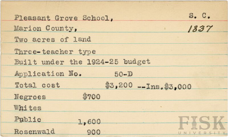 - School card from Rosenwald Fund for Pleasant Grove School in Marion County, South Carolina