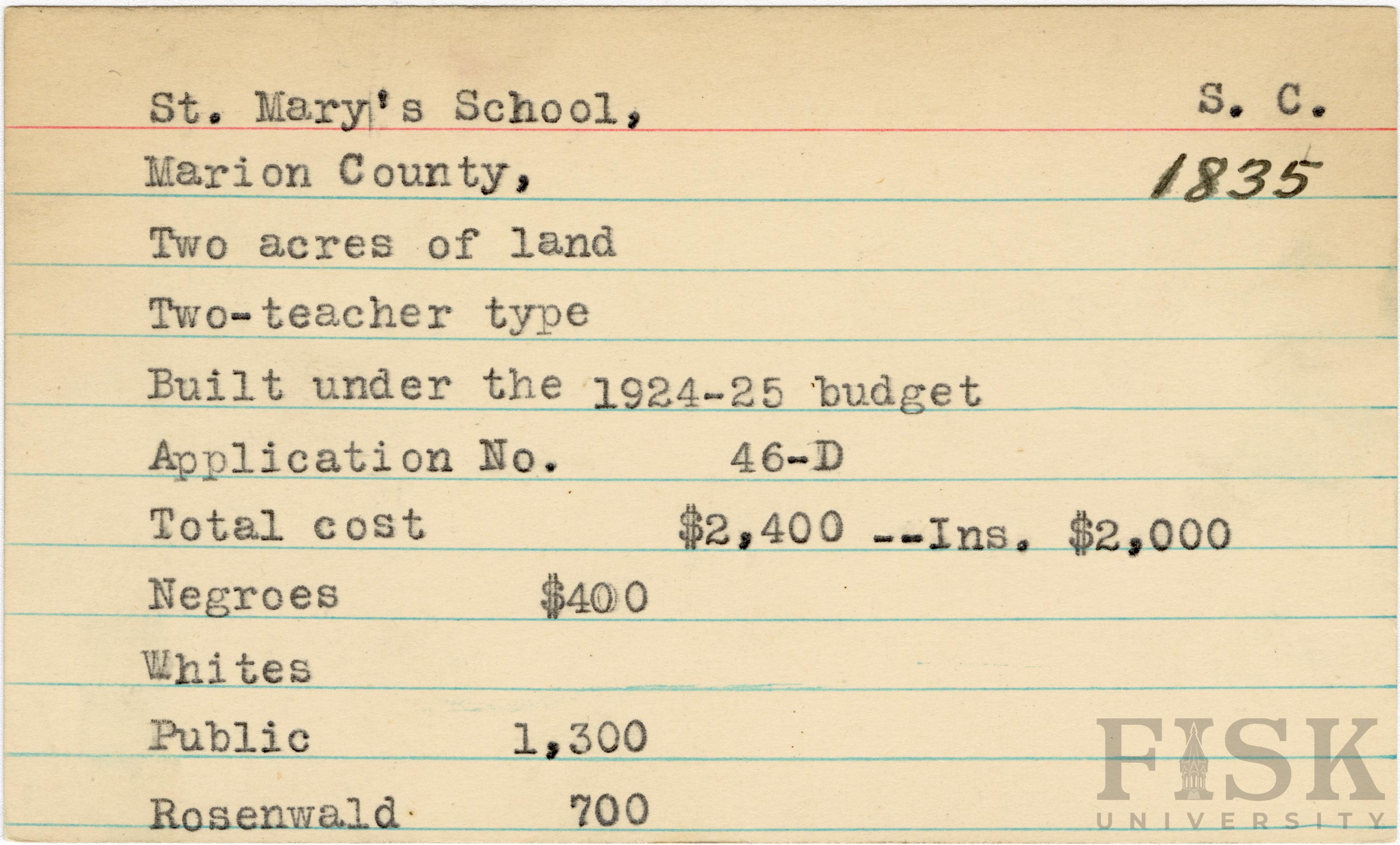 - School card from Rosenwald Fund for St. Mary's School in Marion County, South Carolina with a section added to the budget contributions that says, "Ins. $2,000"