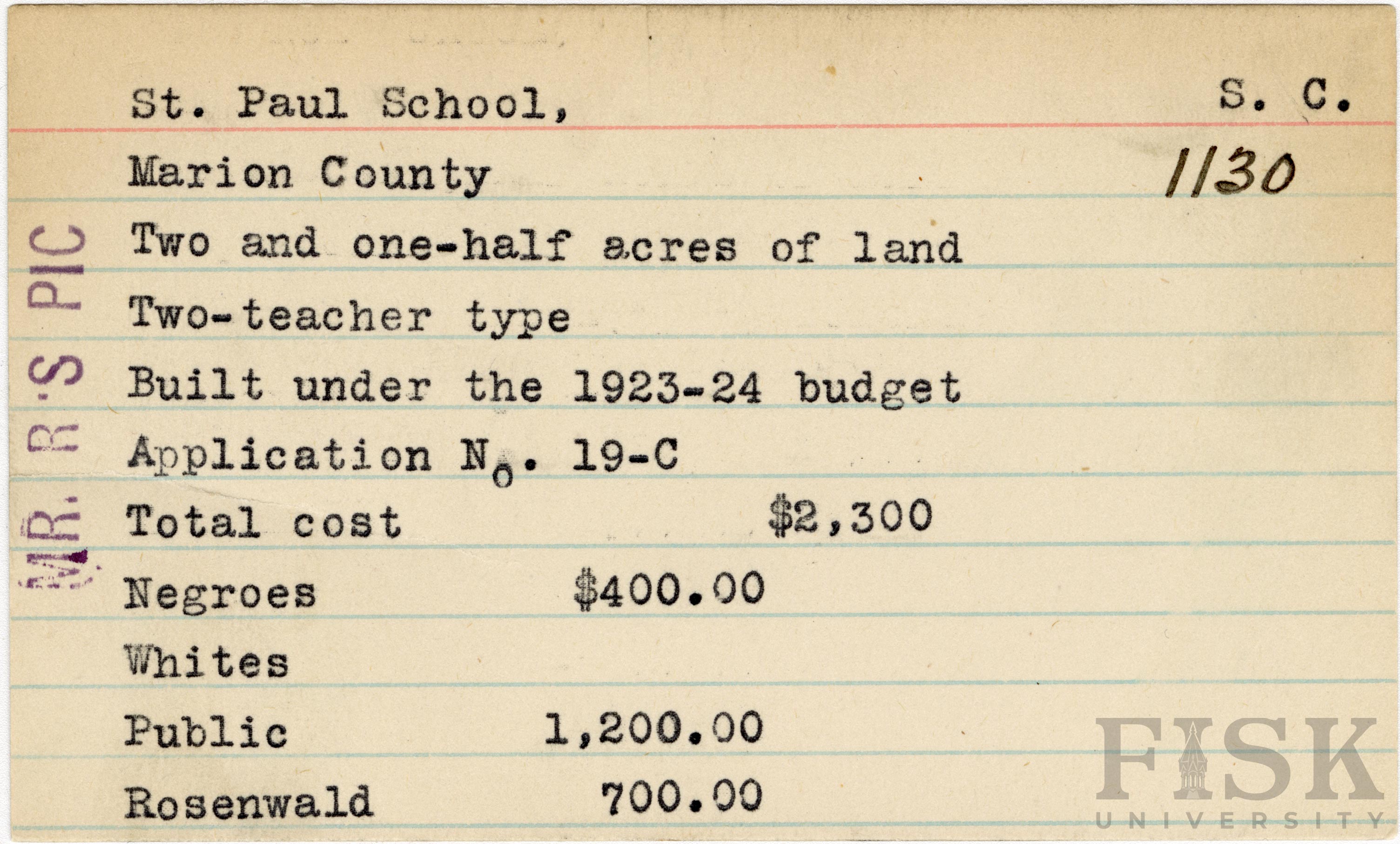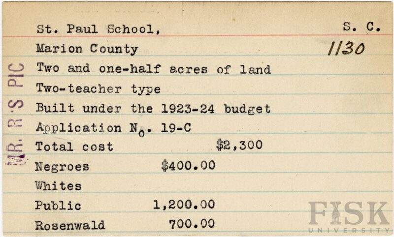 School card from Rosenwald Fund for St. Paul School in Marion County, South Carolina with a note on the far left of the card that says, "Mr. R's Pic"
