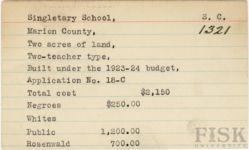 - School card from Rosenwald Fund for Singletary School in Marion County, South Carolina
