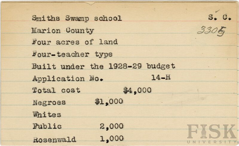 - School card from Rosenwald Fund for Smiths Swamp School in Marion County, South Carolina