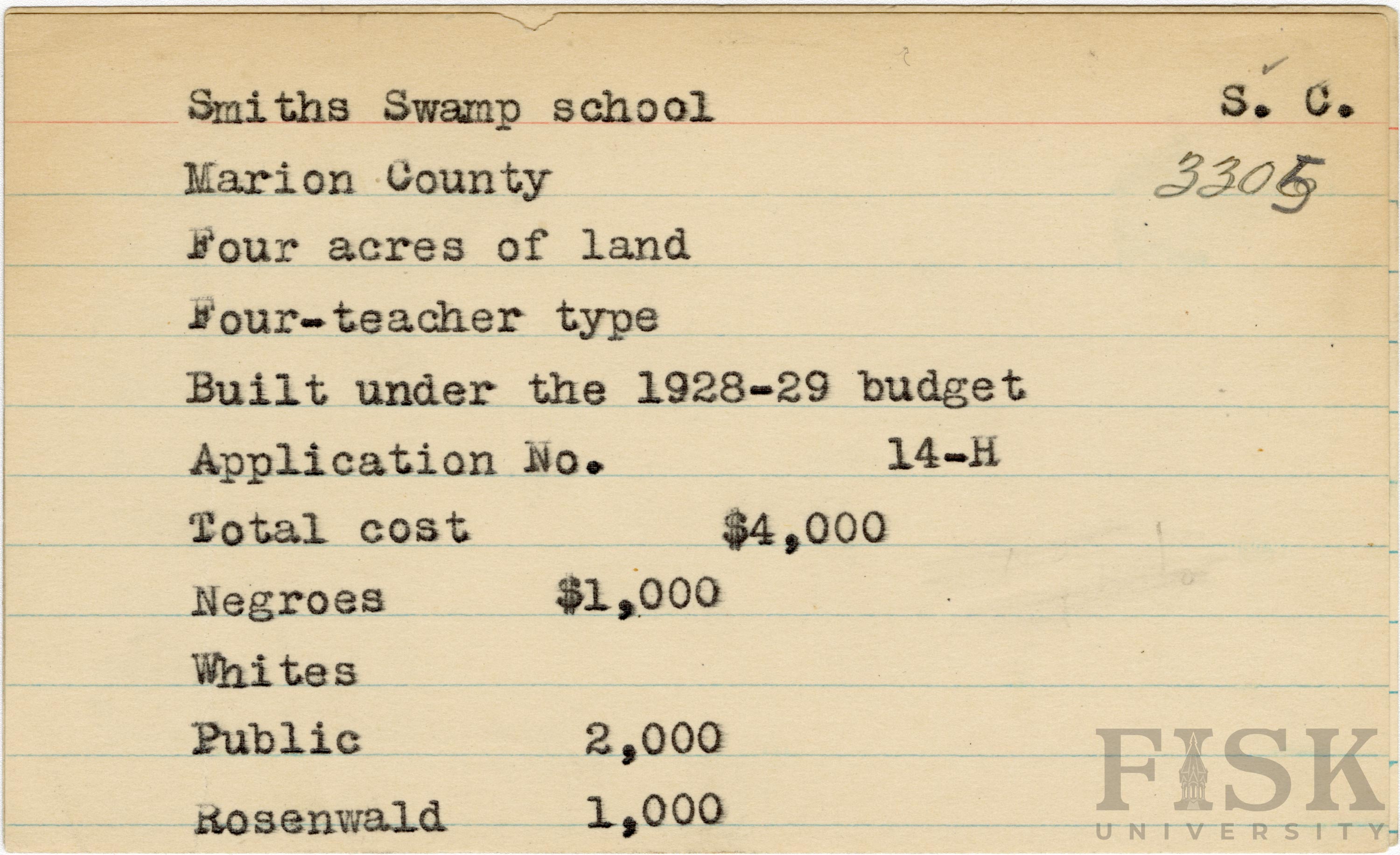 School card from Rosenwald Fund for Smiths Swamp School in Marion County, South Carolina
