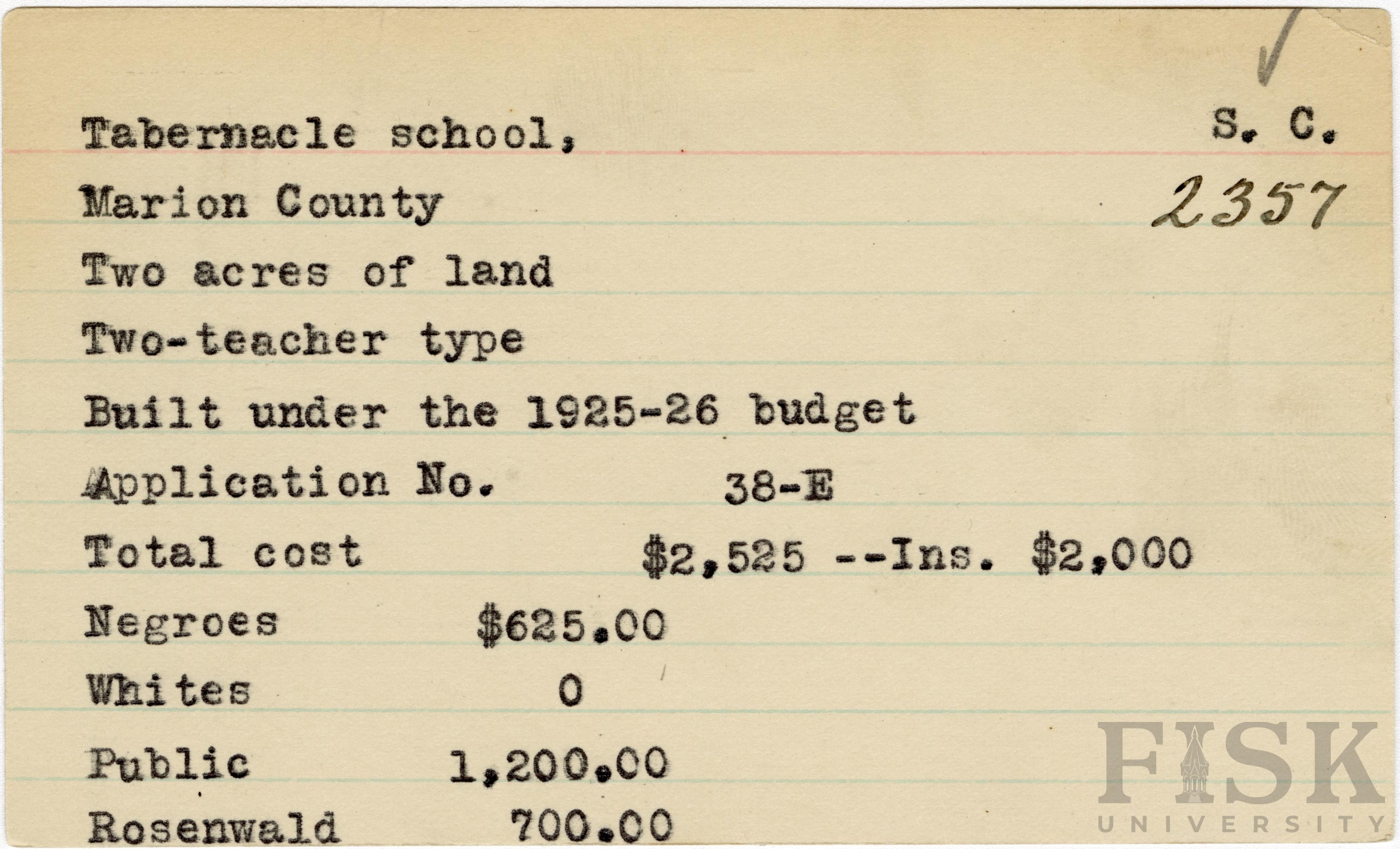 School card from Rosenwald Fund for Tabernacle School in Marion County, South Carolina with a section added to the budget contributions that says, "Ins. $2,000"