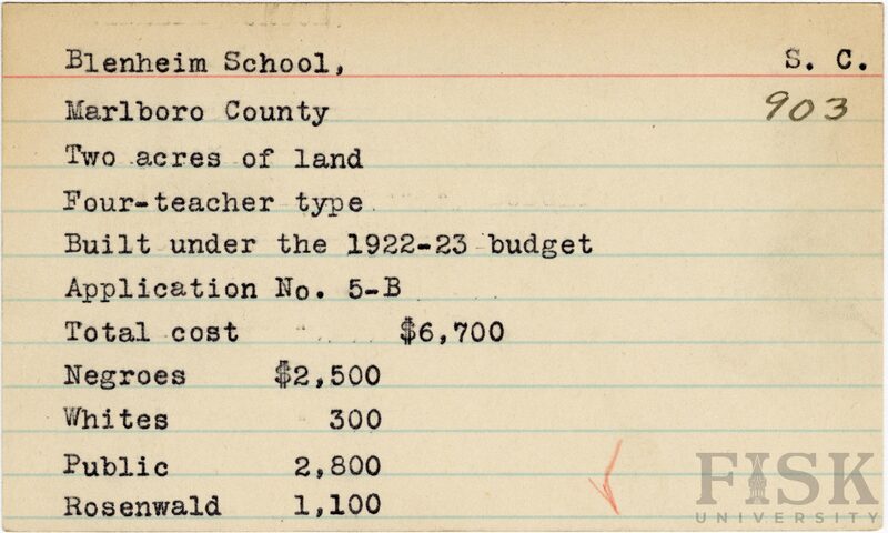 - School card from Rosenwald Fund for Blenheim School in Marlboro County, South Carolina