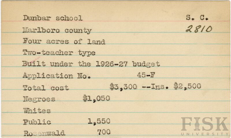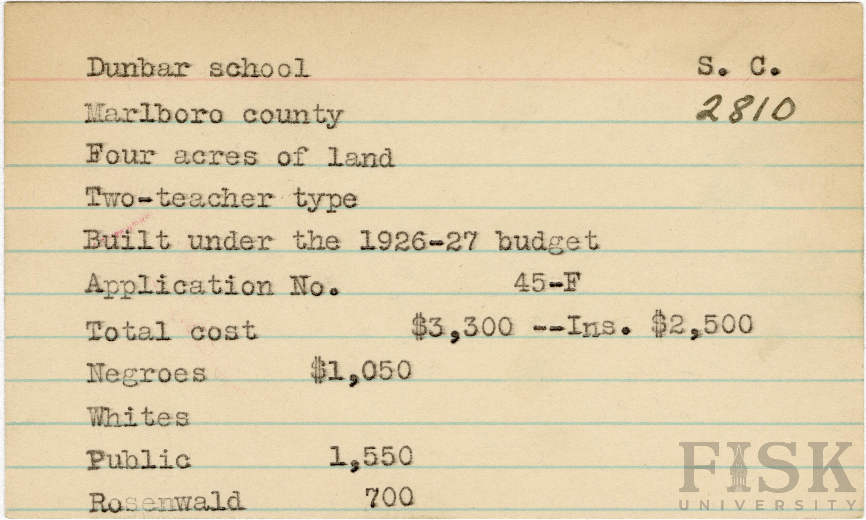 - School card from Rosenwald Fund for Dunbar School in Marlboro County, South Carolina with a section added to the budget contributions that says, "Ins. $2,500"