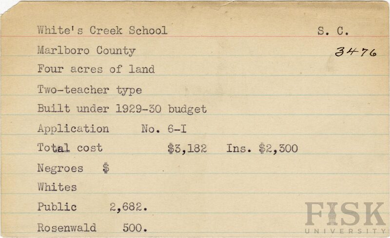 - Julius Rosenwald Fund--Buildings, African American schools--History--20th century, African American schools -- White's Creek School