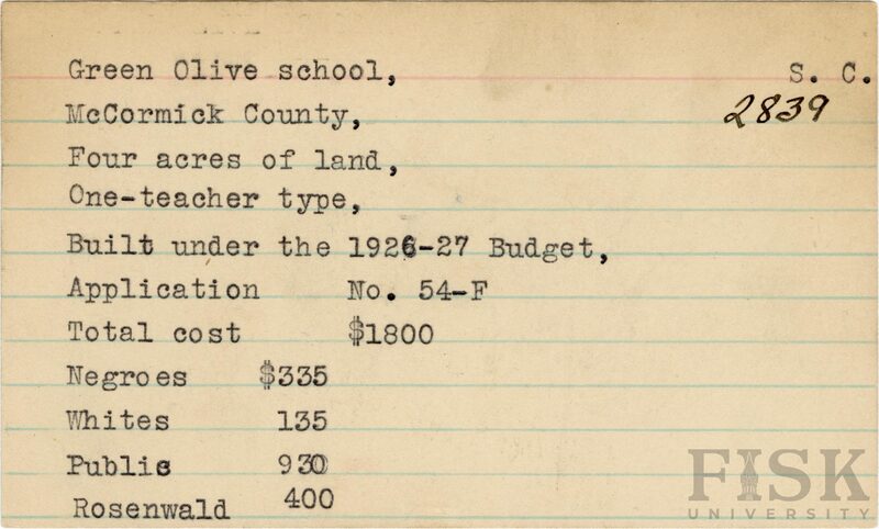 - School card from Rosenwald Fund for Green Olive School in McCormick County, South Carolina