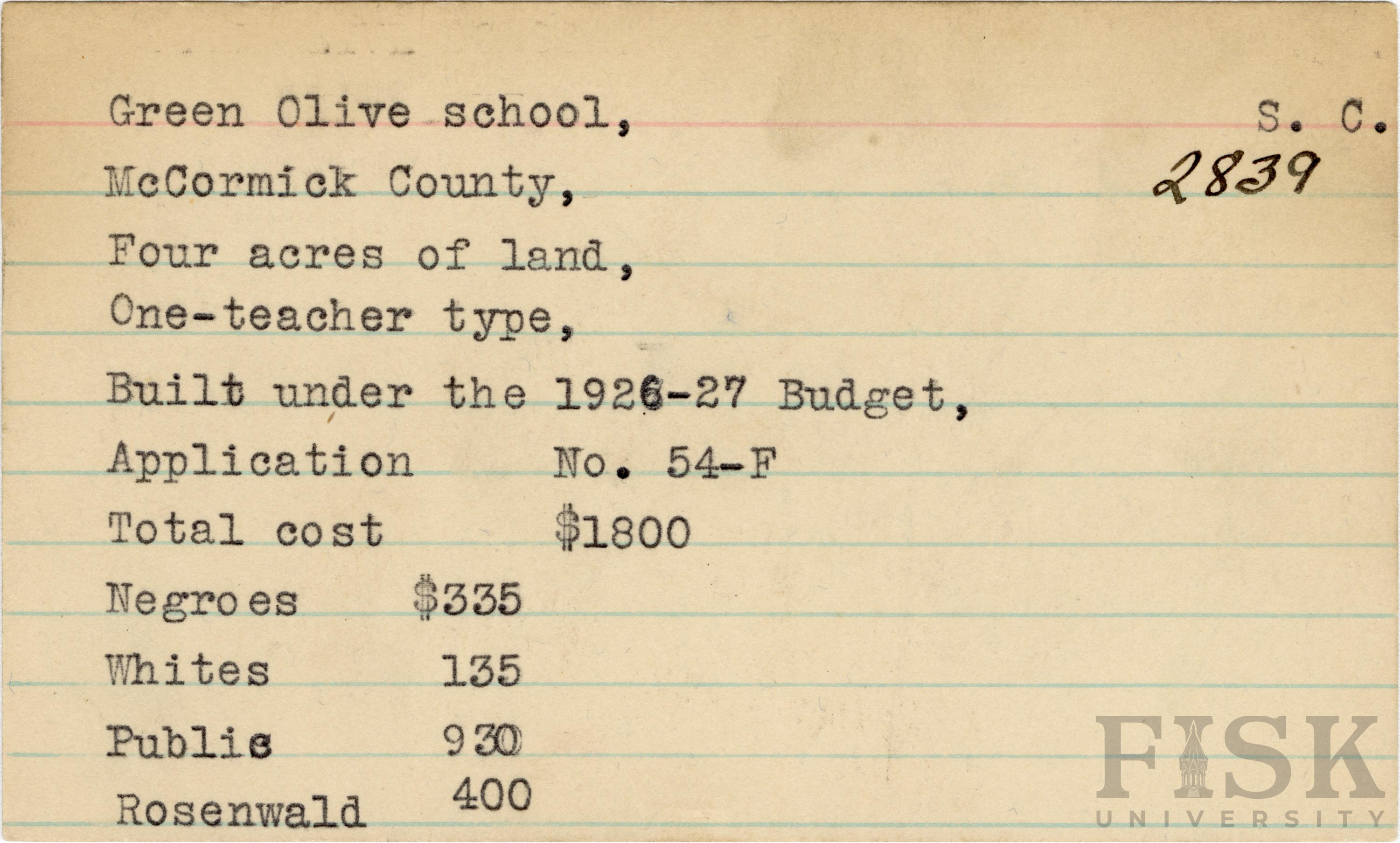 School card from Rosenwald Fund for Green Olive School in McCormick County, South Carolina