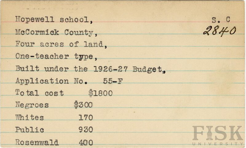 - School card from Rosenwald Fund for Hopewell School in McCormick County, South Carolina