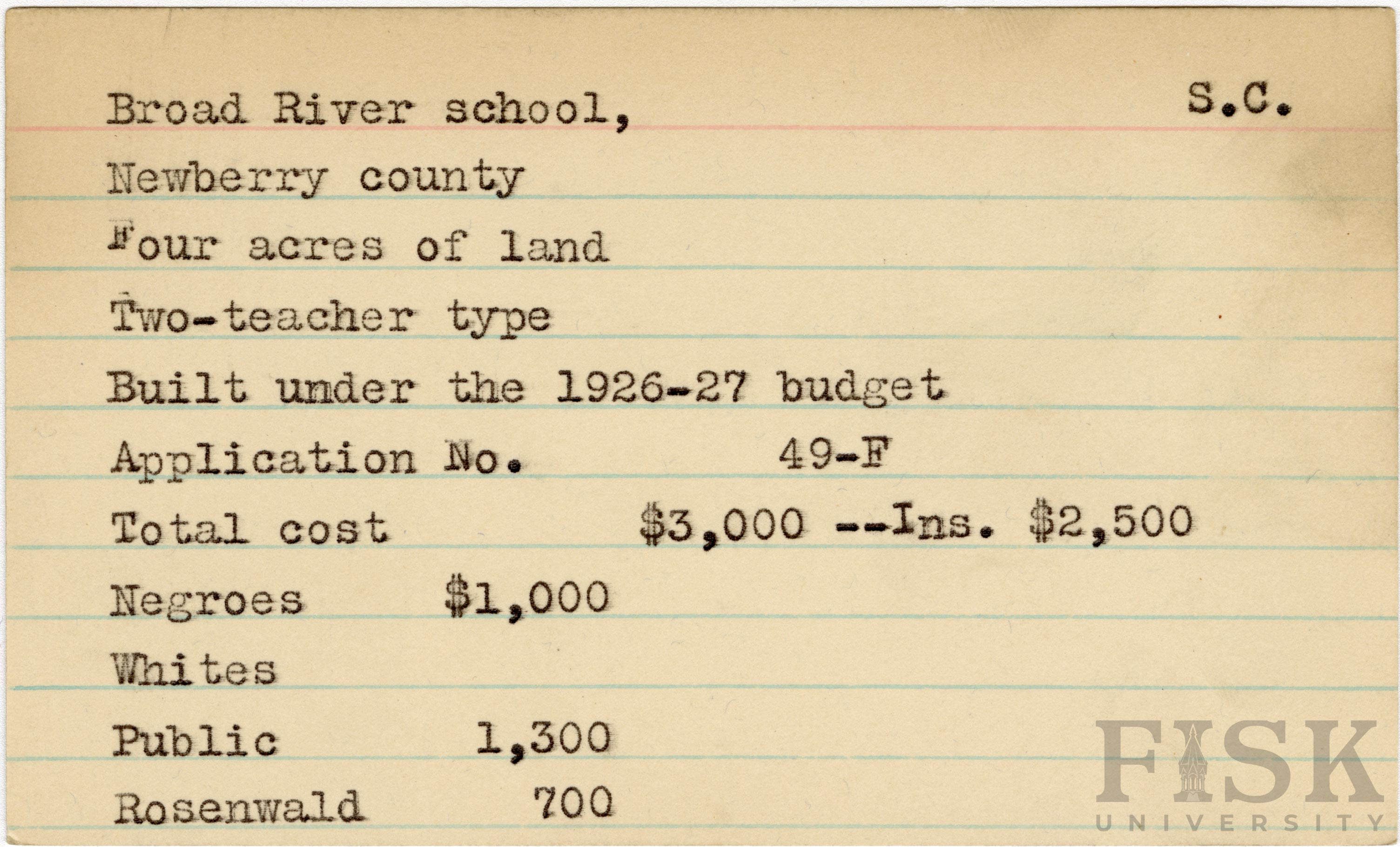 - School card from Rosenwald Fund for Broad River School in Newberry County, South Carolina with a section added to the budget contributions that says, "Ins. $2,500"
