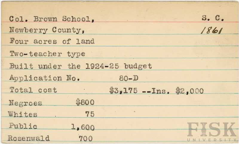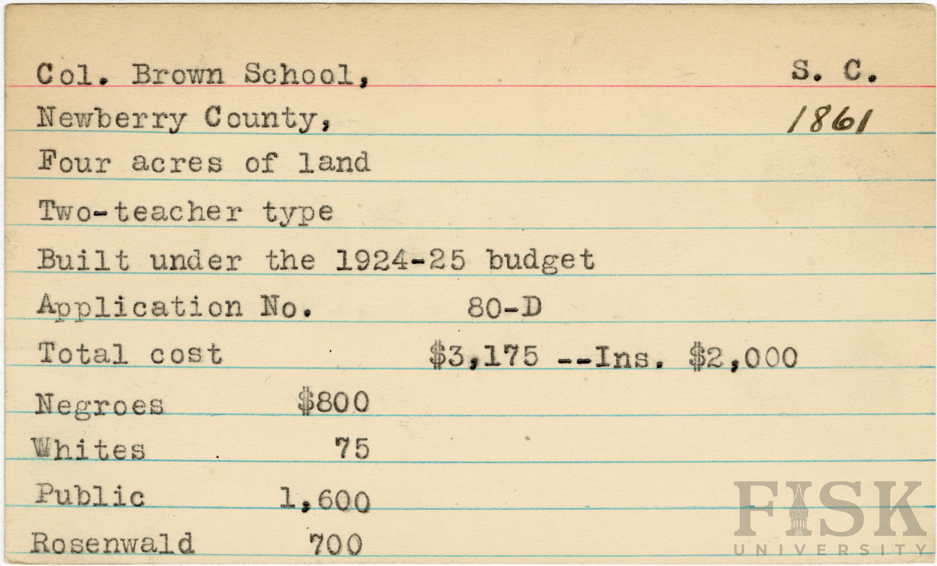 - School card from Rosenwald Fund for Col. Brown School in Newberry County, South Carolina with a section added to the budget contributions that says, "Ins. $2,000"