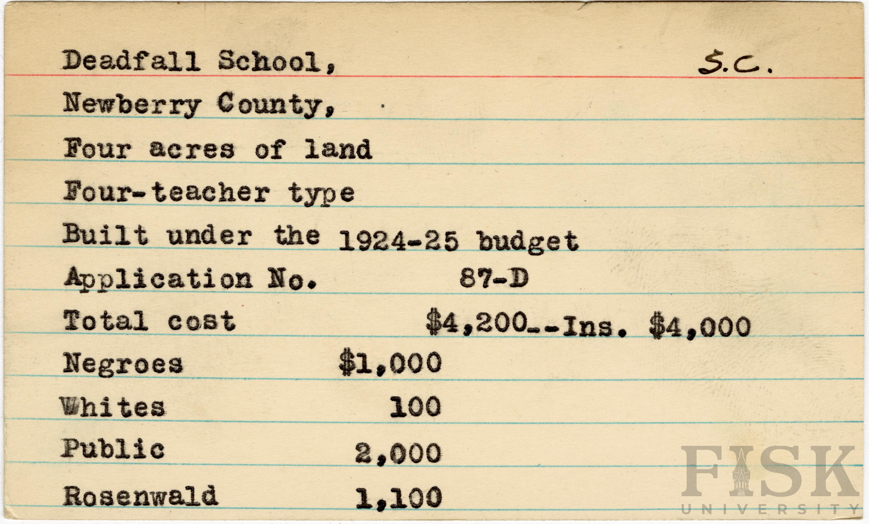 - School card from Rosenwald Fund for Deadfall School in Newberry County, South Carolina with a section added to the budget contributions that says, "Ins. $4,000"