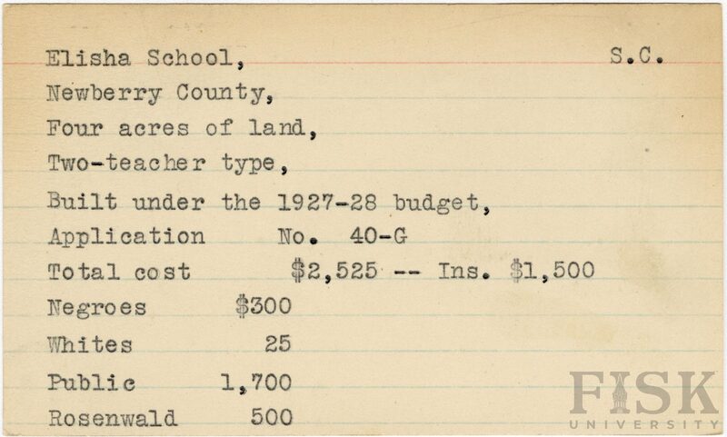 - School card from Rosenwald Fund for Elisha School in Newberry County, South Carolina with a section added to the budget contributions that says, "Ins. $1,500"