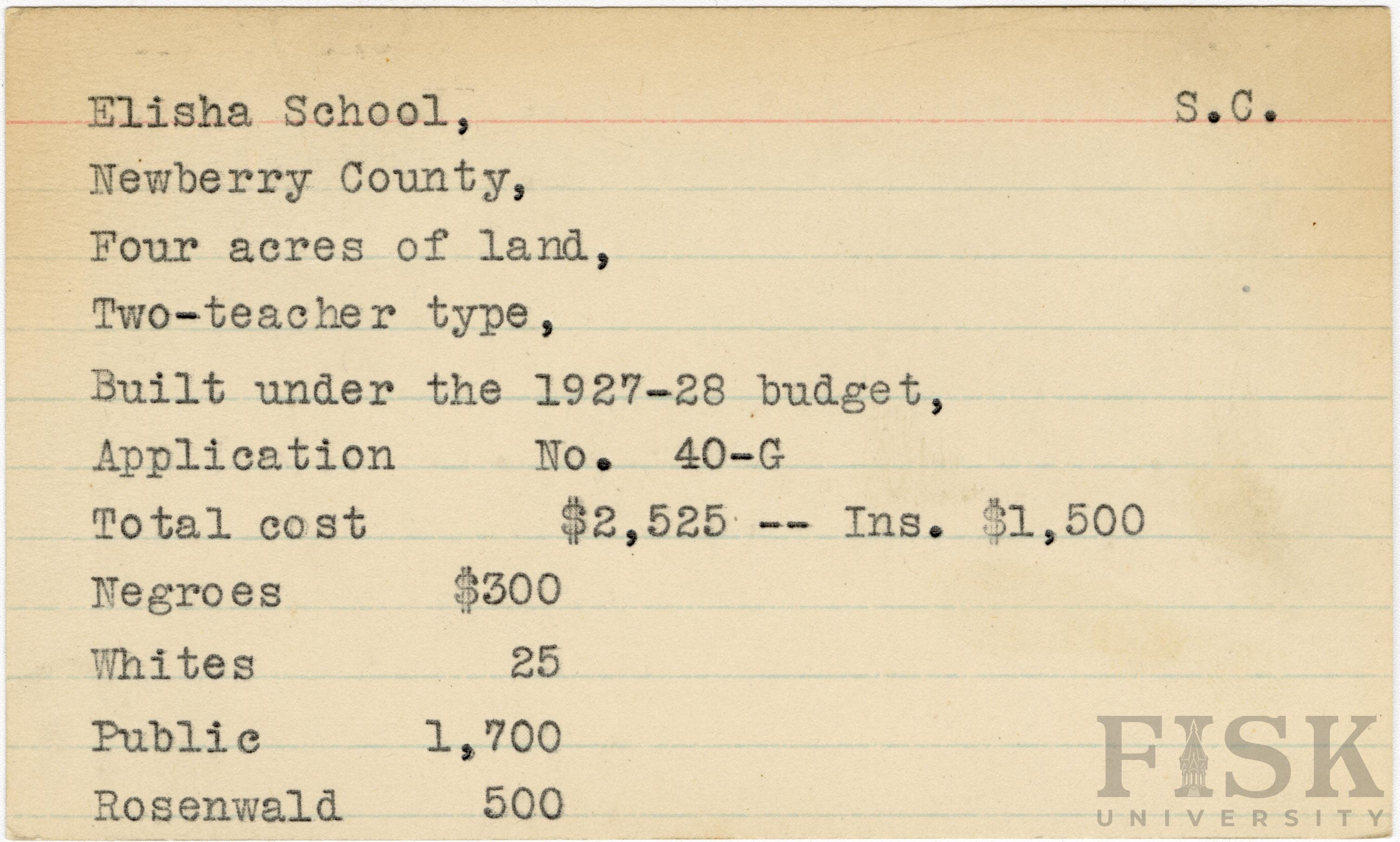 School card from Rosenwald Fund for Elisha School in Newberry County, South Carolina with a section added to the budget contributions that says, "Ins. $1,500"