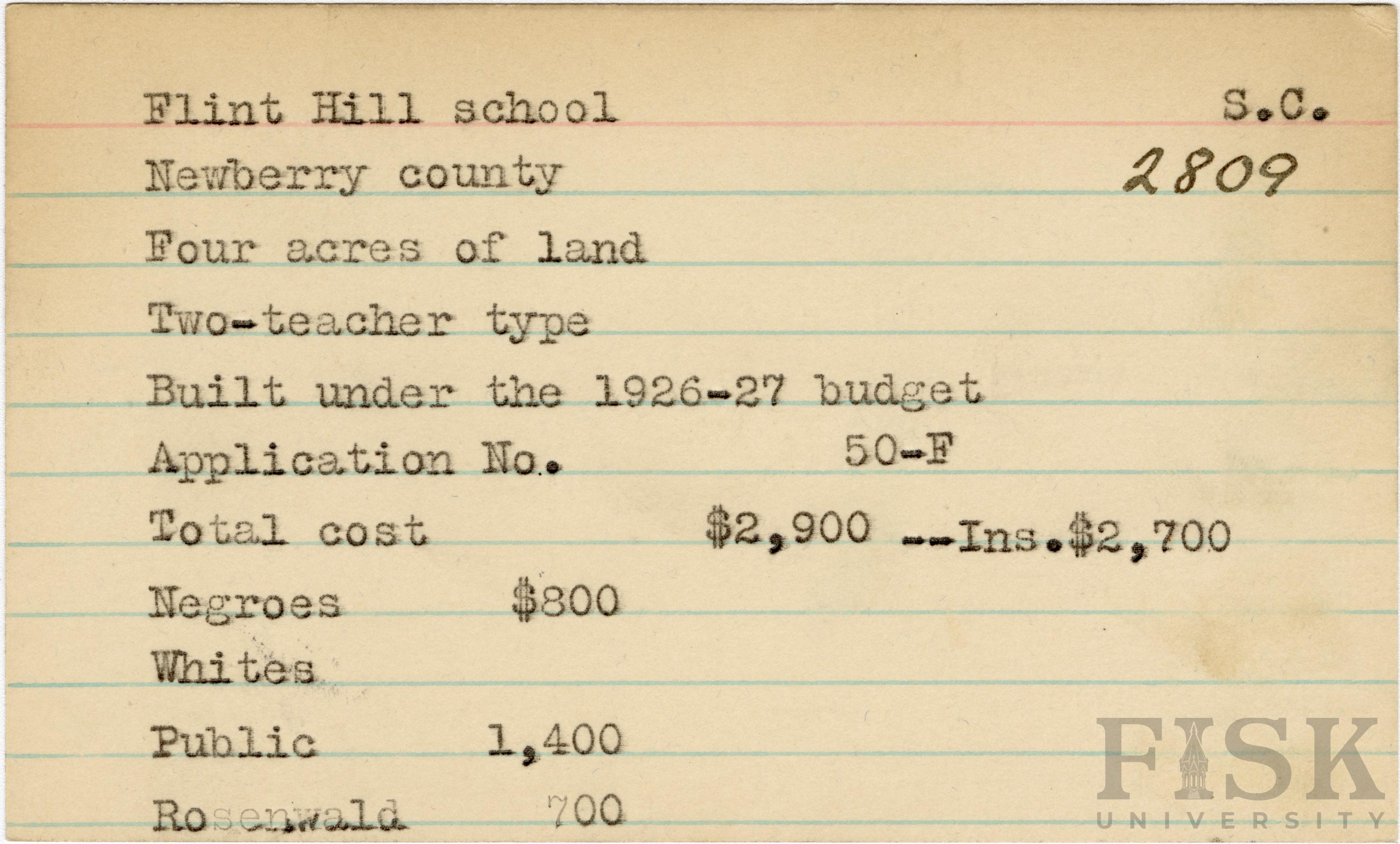 School card from Rosenwald Fund for Flint Hill School in Newberry County, South Carolina with a section added to the budget contributions that says, "Ins. $2,700"