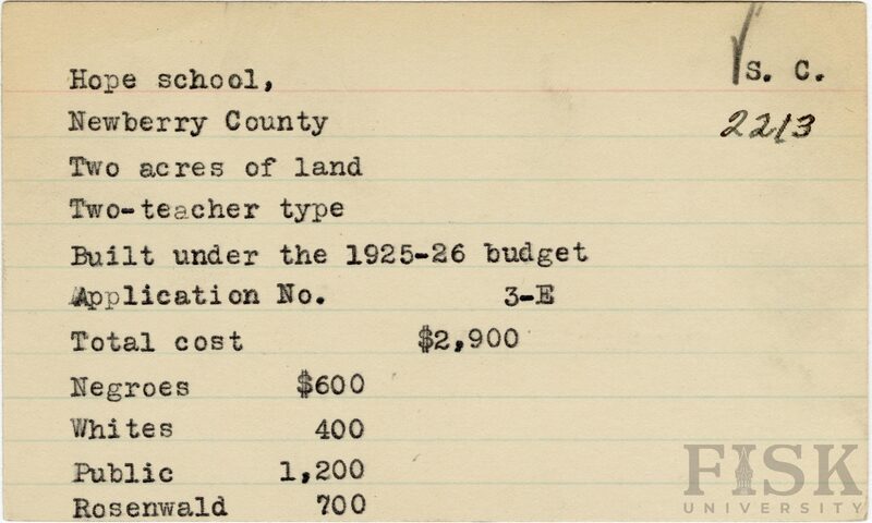 - School card from Rosenwald Fund for Hope School in Newberry County, South Carolina