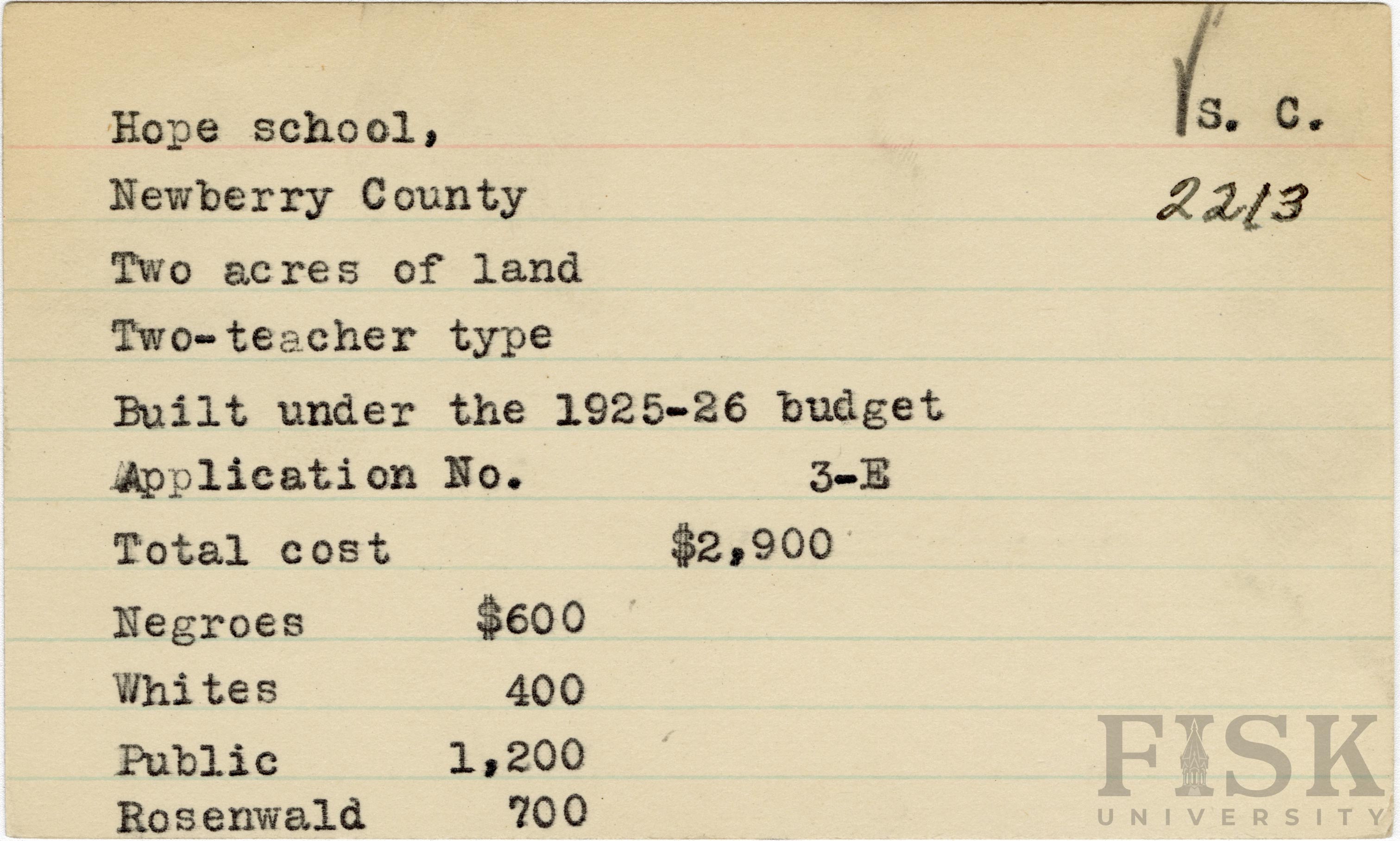 School card from Rosenwald Fund for Hope School in Newberry County, South Carolina