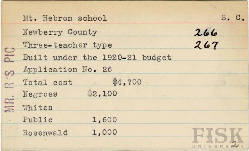 - School card from Rosenwald Fund for Mt. Hebron School in Newberry County, South Carolina with a note on the card that says, "Mr. R's Pic"