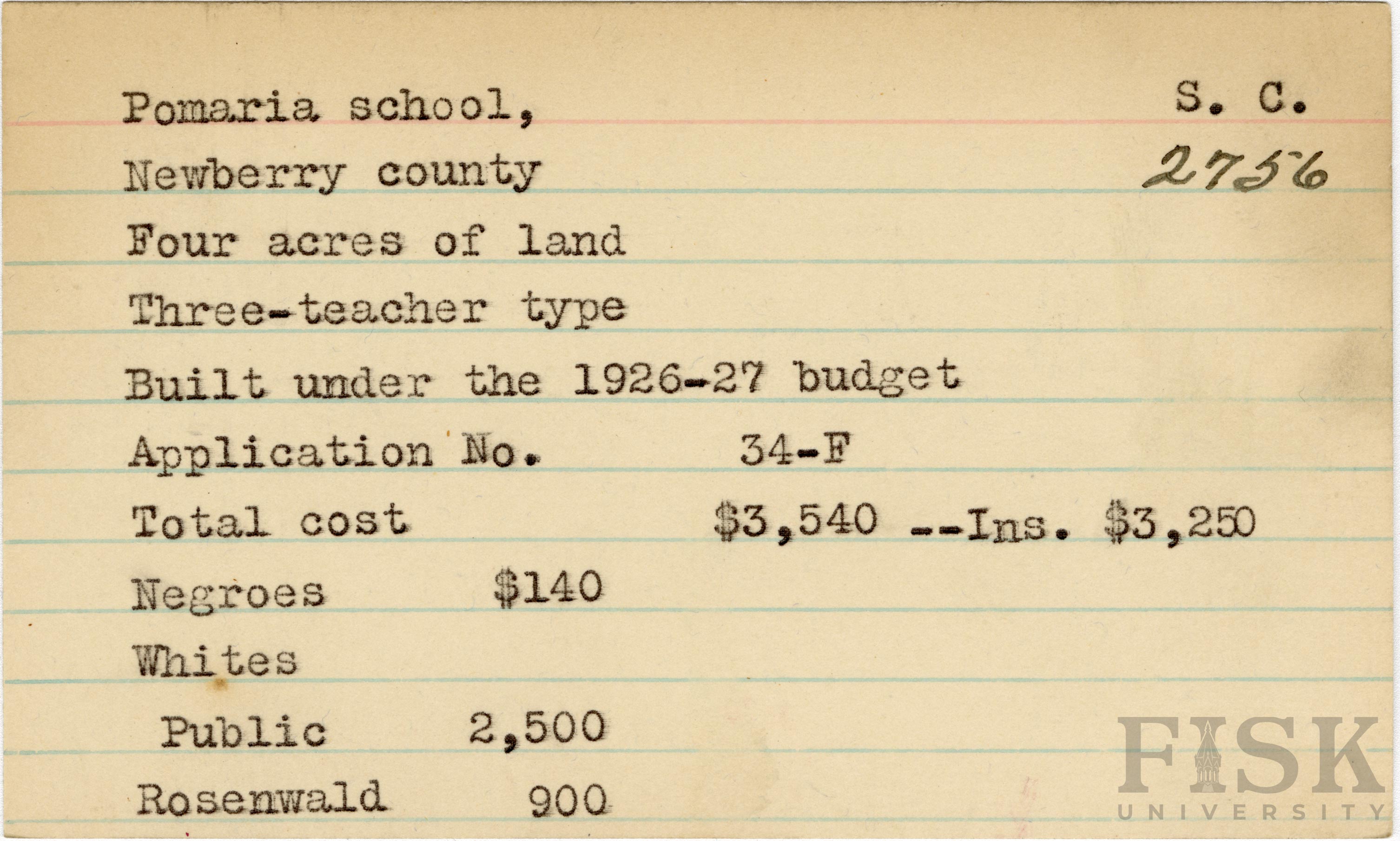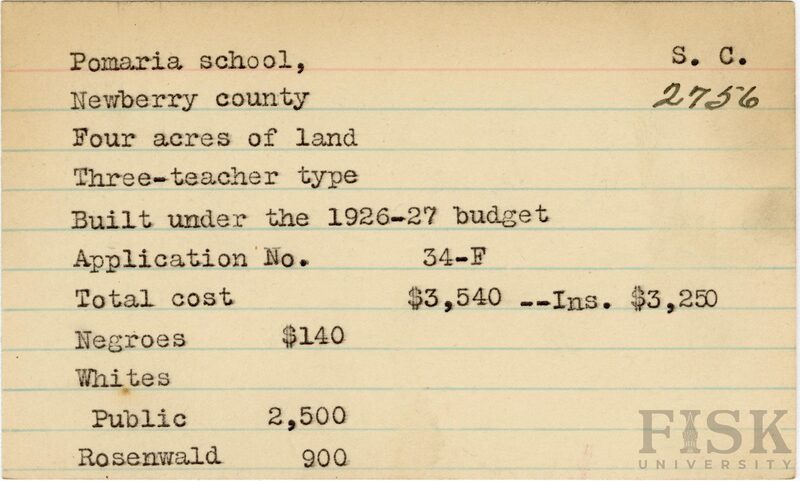 - School card from Rosenwald Fund for Pomaria School in Newberry County, South Carolina with a section added to the budget contributions that says, "Ins. $3,250"
