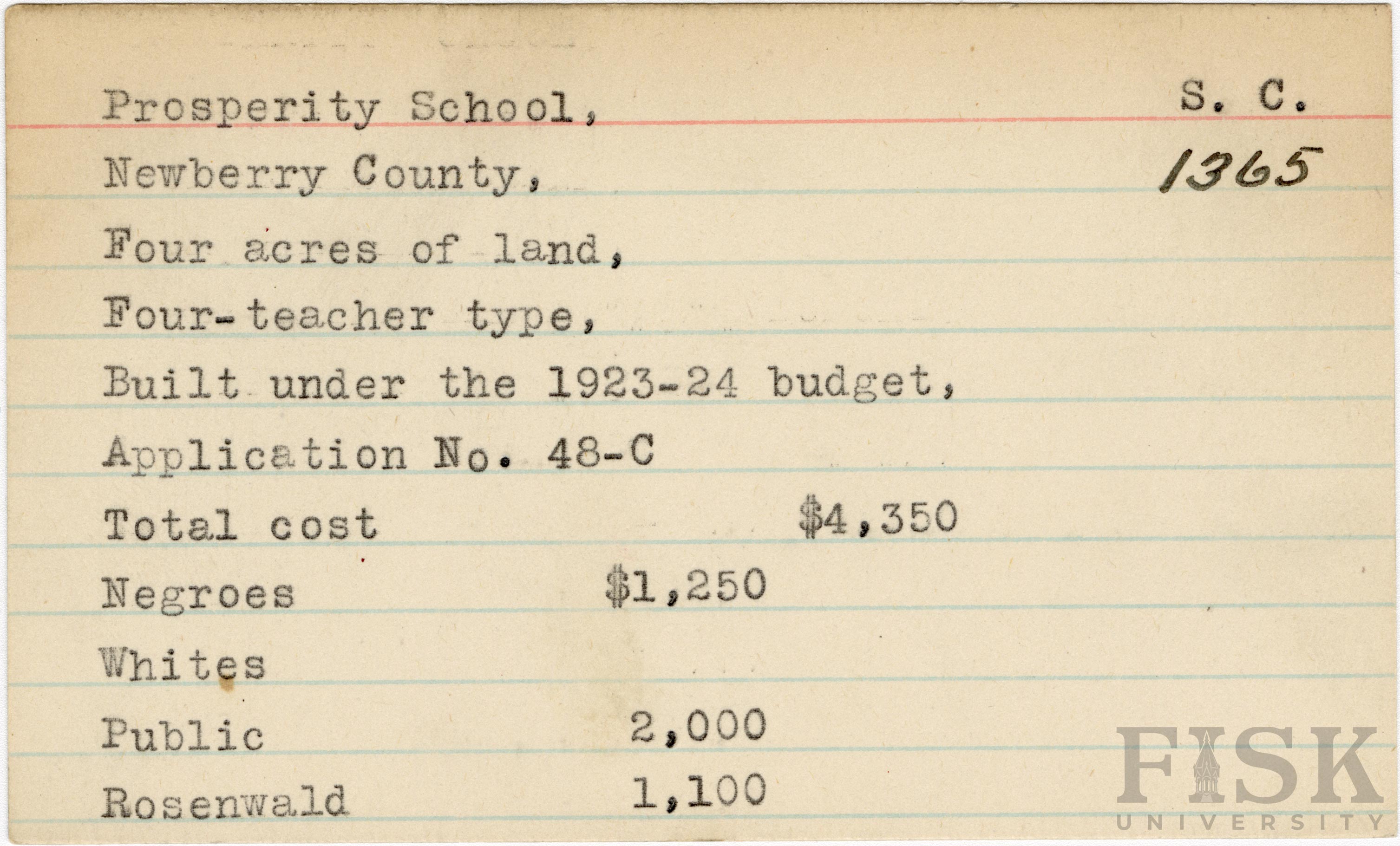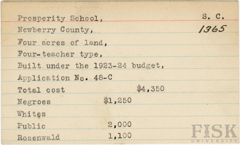 - School card from Rosenwald Fund for Prosperity School in Newberry County, South Carolina