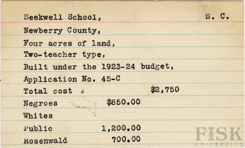 School card from Rosenwald Fund for Seekwell School in Newberry County, South Carolina
