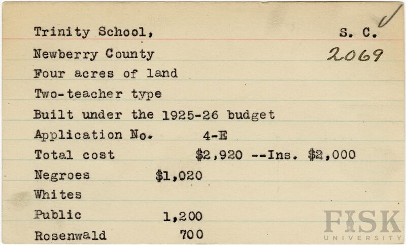 - School card from Rosenwald Fund for Trinity School in Newberry County, South Carolina with a section added to the budget contributions that says, "Ins. $2,000"