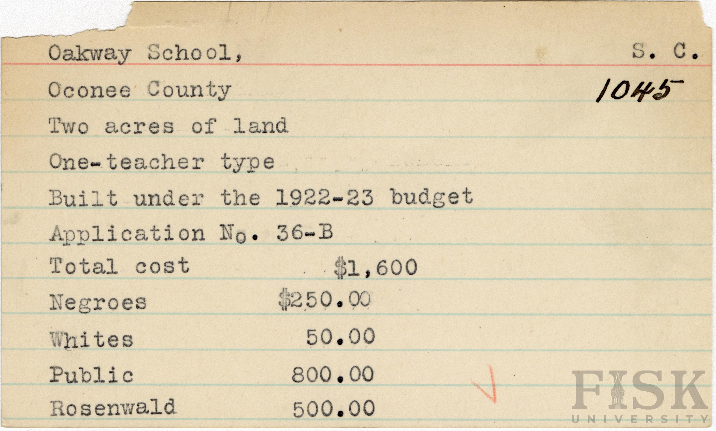 School card from Rosenwald Fund for Oakway School in Oconee County, South Carolina