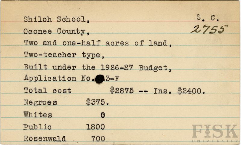 - School card from Rosenwald Fund for Shiloh School in Oconee County, South Carolina with a section added to the budget contributions that says, "Ins. $2,400"