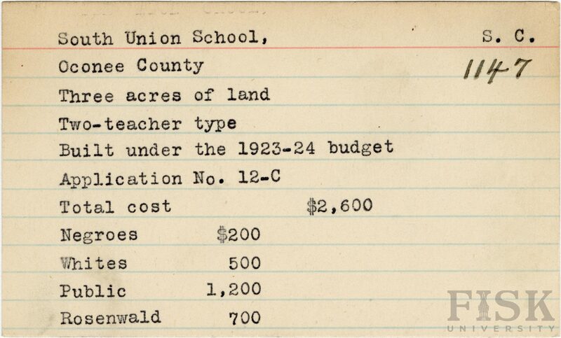 - School card from Rosenwald Fund for South Union School in Oconee County, South Carolina