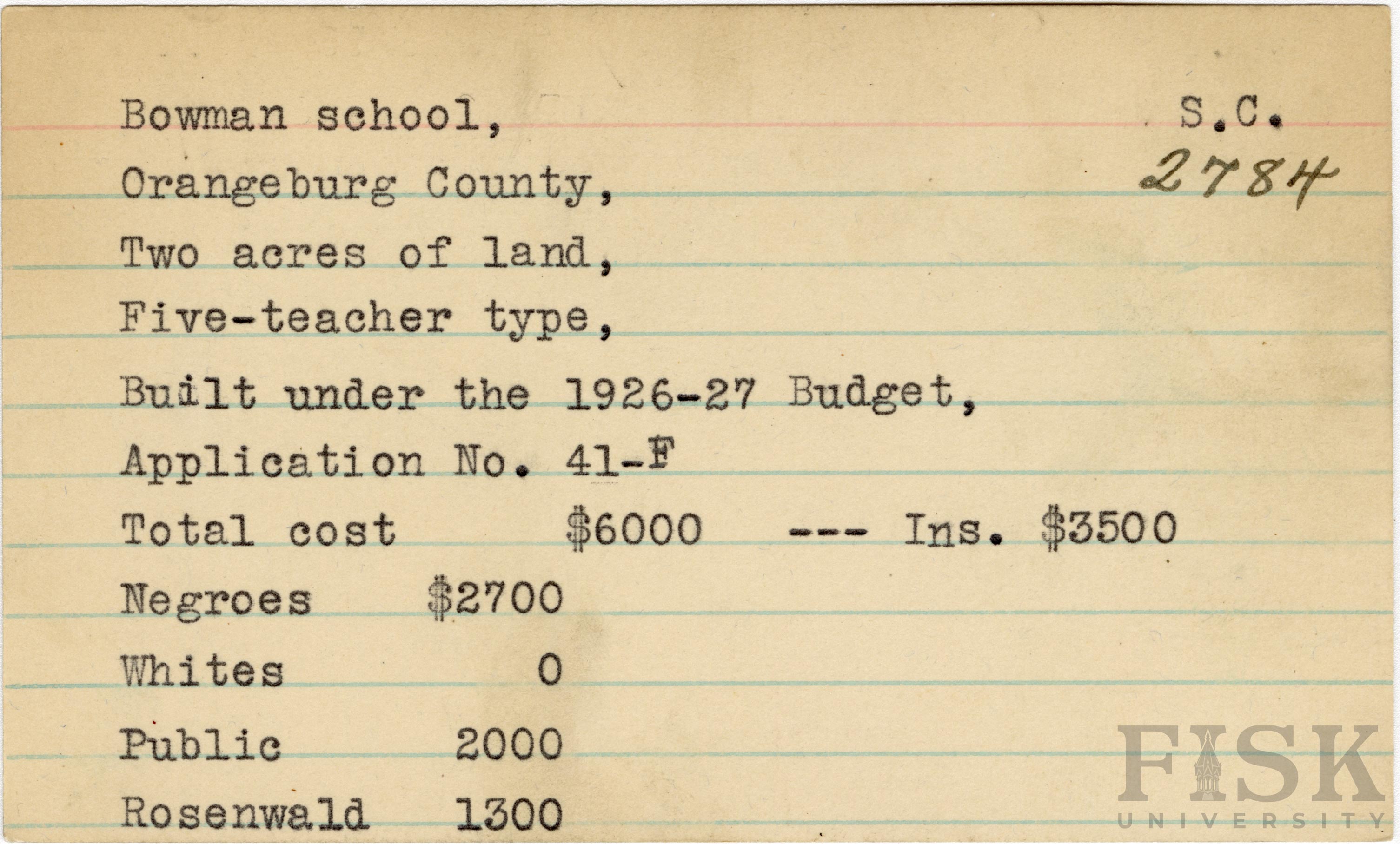 - School card from Rosenwald Fund for Bowman School in Orangeburg County, South Carolina with a section added to the budget contributions that says, "Ins. $3,500"